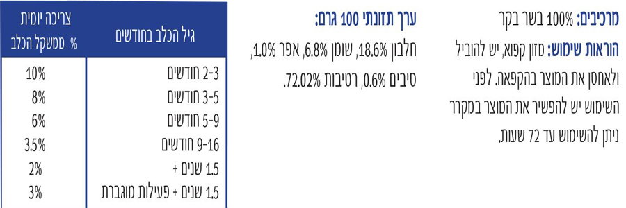 קרניבור Carnivor מזון טבעי לכלבים - מותאם לכל שלבי החיים של הכלבים מגורים ועד בוגרים באריזה של 6 ק"ג מחולקת למנות של 300 גרם.קרניבור Carnivor הינו מזון טבעי המיוצר מ-100% מרכיבי תזונה טבעיים בלבד ואינו מכיל חומרים משמרים.קרניבור Carnivor מזון טבעי לכלבים - מכיל מרכיבי בשר איכותיים כגון נתחי בשר המיועדים למאכל אדם,נתחי פילה סלמון וטונה נקיים וטריים ללא תוספים וירקות טריים המטופלים ברמה הגבוהה ביותר. קרניבור Carnivor מזון טבעי לכלבים - מיוצר בארץ תחת פיקוח ואישורים של משרד החקלאות. קרניבור Carnivor מזון טבעי לכלבים עומד בכל התקנים הנדרשים לכך שהוא אינו מכיל חיידקי מעיים,חיידקי צואה וסלמונלה.חלק מהמתכונים מכילים כ-6% קירשה (דופן קיבה של מעלי גירה) שגורמת לטעימת גבוהה מאוד של המזון כך שאפילו הכלבים הבררנים ביותר לא יוכלו לסרב.